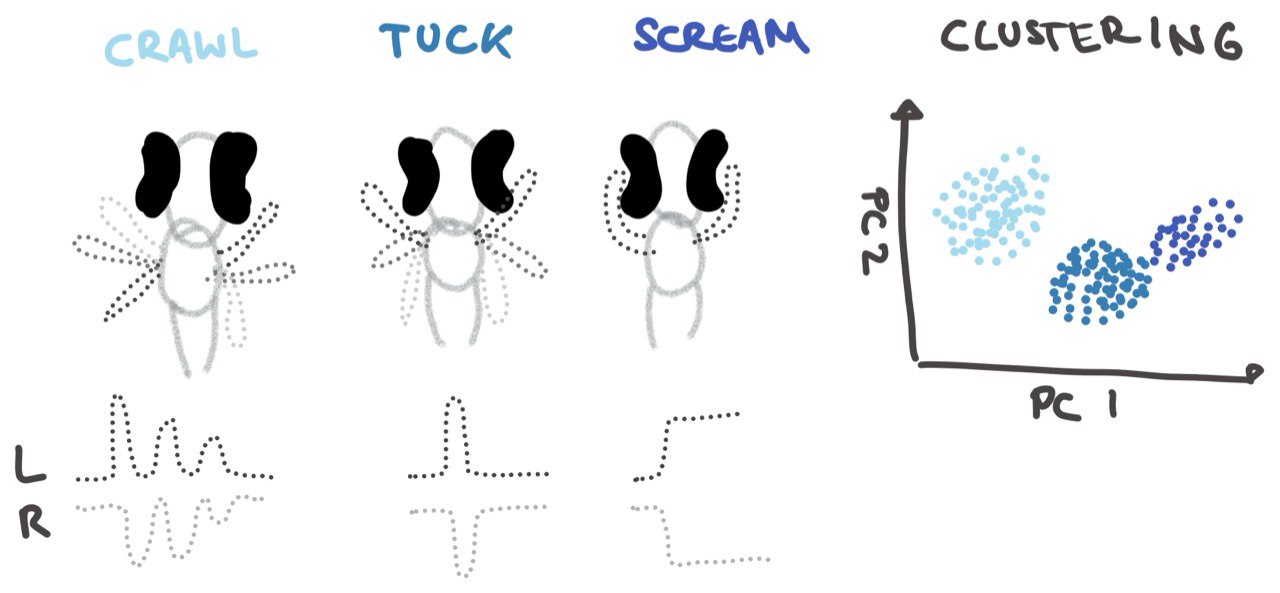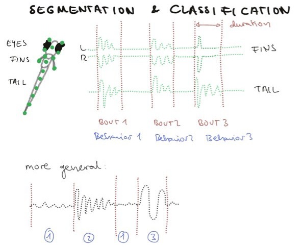 In the case of zebrafish, segmentation is relatively straightforward as they swim in episodes called ‘bouts’ (Figure 2). Different labs have also clustered the behavioral repertoire of eyes [15] and tails [12], with the 13 tail categories by Marques et al being one of the most prominent examples of how fish swim in which context (spontaneous, hunting etc). Previous behavior classifications are a great starting point to also look at the data we got as well.