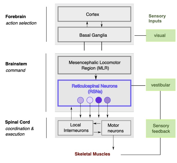 All parts of the nervous system partake in different parts of the process (Figure 6). After an external or internal impulse to move occurs. The action is selected in the forebrain (Cortex), and then mediated via the Basal ganglia to the Mesencephalic Locomotor Region (MLR) in the brain stem. The MLR recruits Reticulospinal Neurons (RSN), which send descending projections to local interneurons in the spinal cord, which drive motor neurons that activate the muscles in the body and limbs to move.